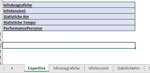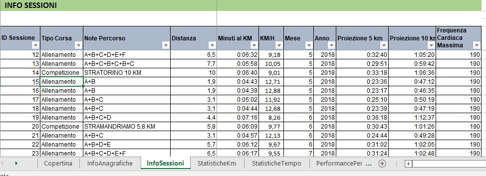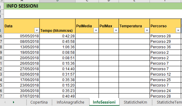 Completate queste informazioni si può iniziare a memorizzare sul foglio InfoSessioni i dati relativi ai propri allenamenti o gare. I dati che si possono inserire sono i seguenti: