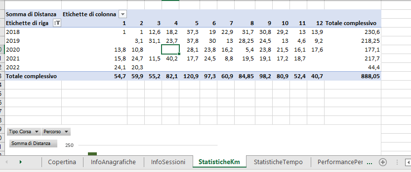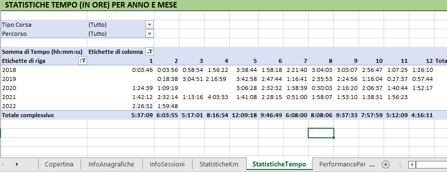 Nel foglio StatisticheTempo l’analisi del tempo impiegato a correre per anno e mese: