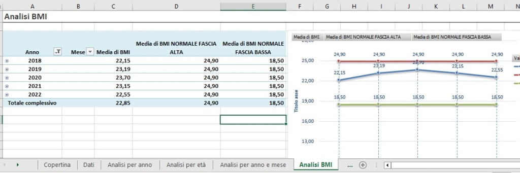 Il modello excel Analisi Peso nasce con l’obiettivo di monitorare il proprio peso corporeo e di confrontarlo con il BMI (calcolo indice massa corporea, per maggiori informazioni vedi la seguente pagina del ministero della Salute)
