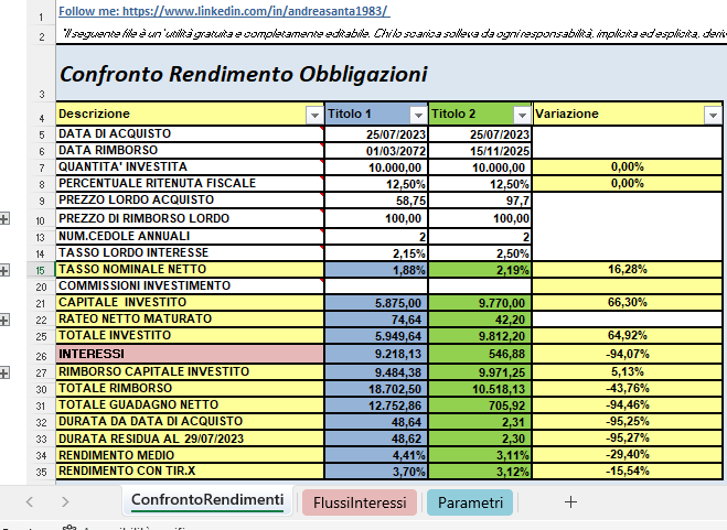Il foglio funziona in modo nativo con quelle a tasso fisso, ma potenzialmente modificando i dati del foglio “Flussi Interessi” potete sfruttarlo a consuntivo per le obbligazioni a tasso variabile.